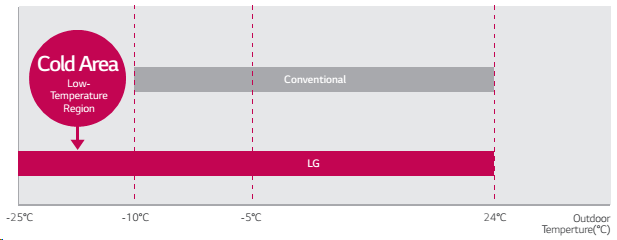 Lai tööpiirkond LG soojuspumpadel kindlustab, et Teie tuba on soe ka väga madalatel välistemperatuuridel.