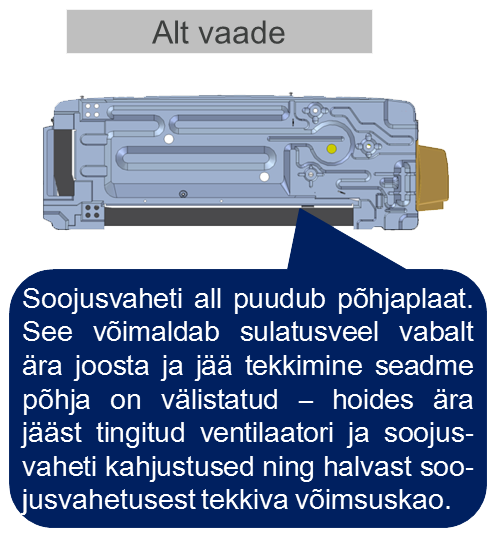 Soojusvaheti all puudub põhjaplaat. See võimaldab sulatusveel vabalt ära joosta ja jää tekkimine seadmepõhja on välistatud – hoides ära jääst tingitud ventilaatori ja soojusvaheti kahjustused ning halvast soojusvahetusest tekkiva võimsuskao.