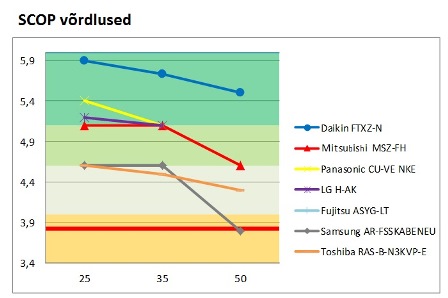 Daikin uue õhksoojuspumba efektiivsusnäitajad on hetkel KÕIGILE teistele soojuspumba tootjatele kättesaamatud. Optimeeritud energiakulu on aidanud tõsta soojusteguri SCOP (aasta keskmise kasuteguri ) suuruseni kuni 5,9.