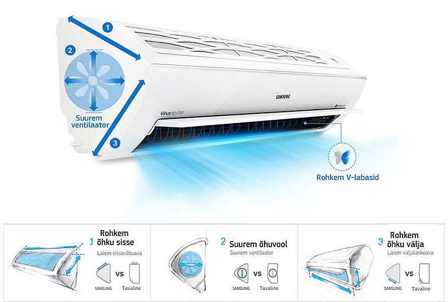 Samsungi kliimaseade on kujundatud algusest peale erakordselt tõhusaks. Tänu ainulaadsele kolmnurksele disainile on sel laiem sissevõtuava, nii et sisse saab tõmmata rohkem õhku. Väljutusava täiustatud laius ja kaldnurk, täiendavad V-labad ja suurem ventilaator tagavad õhu jahutamise ning väljapaiskamise kiiremini, kaugemale ja laiemalt*. Nii jõuab värskendavalt jahe õhk toa igasse nurka. * Testitud mudeli AR09HSFSBWK puhul. Võrreldes Samsungi tavamudeliga AQV09TWS.