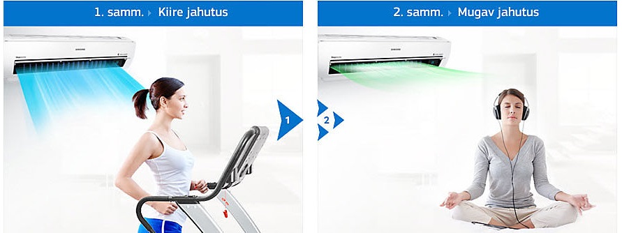 Samsungi kliimaseade hakkab kiiresti õhku jahutama, kasutades võimsat kiirjahutusrežiimi, et kiiresti tulemus saavutada. Seejärel lülitub see mugava jahutuse režiimi, et soovitud temperatuuri säilitada. Nii ei hakka teil külm ning pole vaja ka seadeid käsitsi muuta ega kliimaseadet sisse ja välja lülitada.