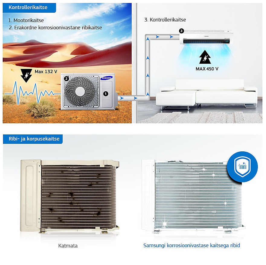Samsungi kliimaseade saab hakkama ka kõige raskemates keskkondades. Selle tehnoloogia Triple Protector Plus ennetab kompressori ja kontrolleri ülekoormust elektrikatkestuste ja pingekõikumiste ajal, vajamata eraldi pingestabilisaatorit. Lisaks on sel korrosioonivastane kattekiht, et kaitsta kondensaatorit korrodeerumise ja korpust roostetamise eest. Suurem kondensaator ja optimeeritud jahutusvool tagavad seadme vastupidavuse ka väga kõrgetel temperatuuridel (kuni 58 ºC)*. * Testitud mudeli AR09HPSDDWK/SG puhul. Võrreldes Samsungi tavamudeliga AR09HPSDFAP/RC.