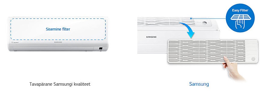 Vastupidiselt tavalistele filtritele, millele on sageli raske juurde pääseda, asub Samsungi kliimaseadme Easy Filter väljaspool, seadme ülaosas. Nii on seda lihtne välja võtta, puhastada ja tagasi panna, avamata selleks katet või tõmbamata tugevasti, et see välja saada. Lisaks filtreerib selle antibakteriaalne kattekiht välja tolmu, ohtlikud lenduvad saasteained ja allergeenid.* * Testitud Korea katselaboris (FITI / KEMTI) ja Jaapani katselaboris (ITEA). Andmed on mõõdetud kindlates katsetingimustes ja võivad erineda olenevalt keskkonnateguritest.