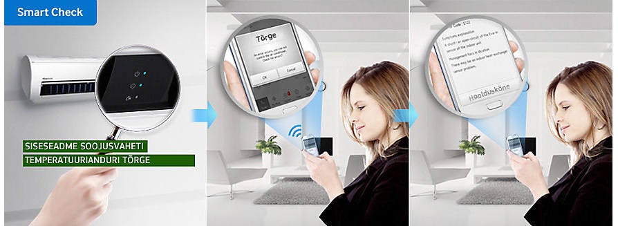 Samsungi kliimaseadmel on automaatne tõrkejälgimissüsteem Smart Check. See tuvastab ja diagnoosib probleemid varases etapis ning pakub kiireid ja lihtsaid tõrkeotsingulahendusi, kasutades nutitelefonirakendust*. Nii hoiate aega kokku, kuna pole vaja otsida kasutusjuhendit, ning väldite tarbetuid tehniku väljakutsest tulenevaid kulusid ja ebamugavust** ning tõenäoliselt suuri remondiarveid. * Saadaval iPhone’ile ja Android-seadmetele. ** See funktsioon töötab ainult teatud tõrkerežiimi puhul ega sobi perioodilise hoolduskontrolli asendamiseks.